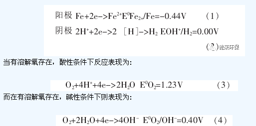 所用材料的鑄鐵屑和活性碳或焦碳,鑄鐵屑是鐵和碳的合金,其內(nèi)部主要由純鐵和碳化鐵(Fe3C)組成,其中Fe3C以極為細小的微粒分散在鐵屑內(nèi)。當將鑄鐵鐵屑浸沒在電解質(zhì)溶液中時,由于Fe3C比純鐵更耐腐蝕,二者之間存在著明顯的氧化還原電勢差,這樣便在純鐵和碳化鐵之間形成了無數(shù)多個細微原電池,純鐵為陽極,F(xiàn)e3C為陰極。另一方面鐵屑與活性碳形成較大的原電池,鑄鐵為陽極,碳為陰極,使鐵屑在受到微原電池腐蝕的基礎上,又受到較大原電池的腐蝕。在這些細微原電池中,陽極在電池反應中表現(xiàn)為失去電子被氧化,而陰極得到電子被還原,但反應比較復雜。在微電池中電極反應為: